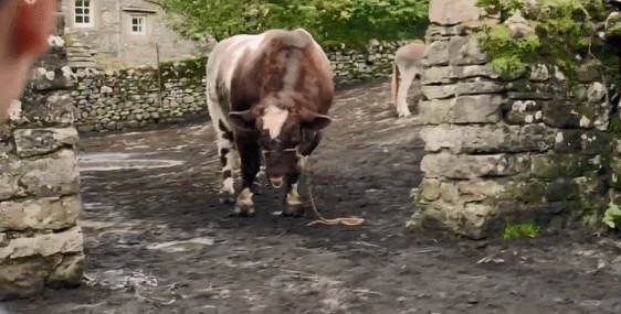 被和他一样高的大牛吓得跳上墙。