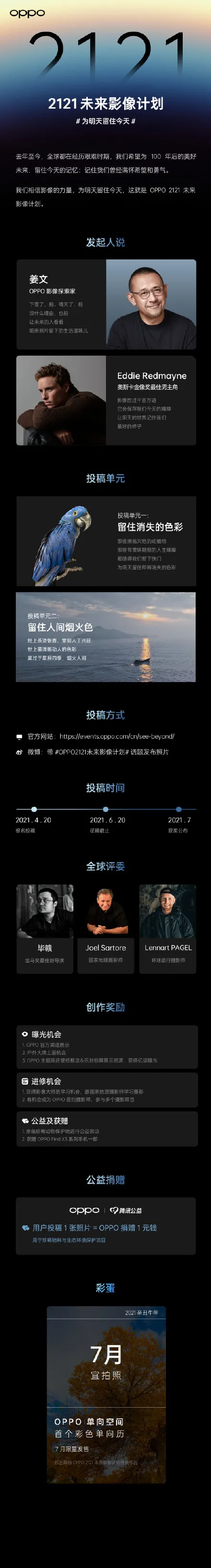 “去年至今,全球都在经历艰难时期,我们希望为100年后的美好未来,留住今天的记忆:记住我们曾经满怀希望和勇气。我们相信影像的力量,为明天留住今天,这就是OPPO2121未来影像计划”。